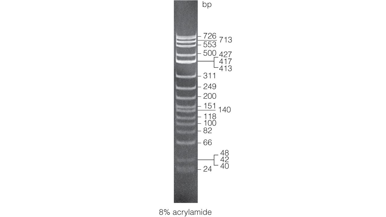 The ΦX174 DNA/HinfI Markers have 20 ethanol-precipitated DNA fragments ranging in size from 24bp to 726bp.